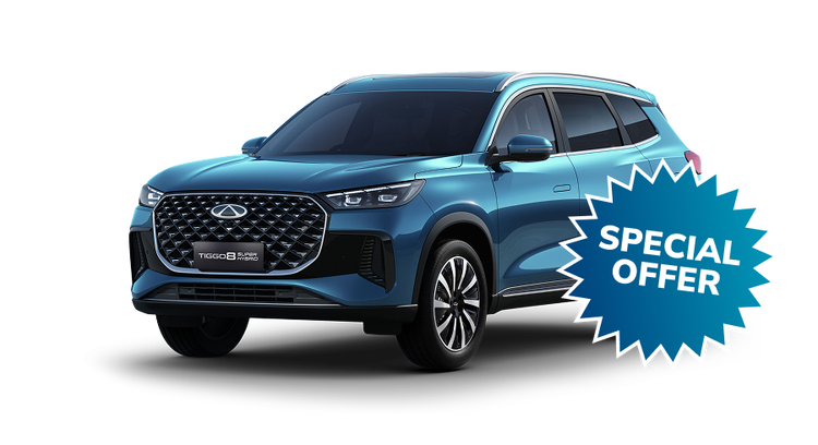 The Chery Tiggo 8 Super Hybrid is a 5-door, 7-seater SUV with front-wheel drive. It features a turbo engine paired with an electric motor with regenerative charging, 1.3L/100km fuel consumption, and has a fast charge time of 20 minutes.